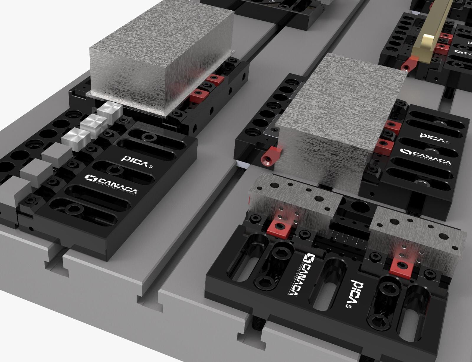 Multiple parts can be clamped using independent Pitbull clamps. The detachable front jaw structure allows for clamping parts up to 30 mm in height during second operations. It is a robust alternative to conventional vises.